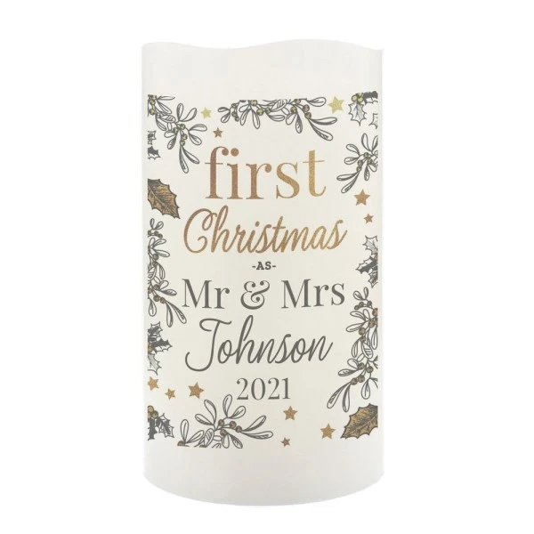 This cute festive pillar candle is the perfect gift for any couple celebrating their first Christmas as a married couple.