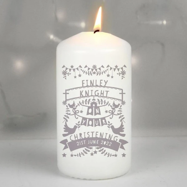 This Grey Paper Cut Pillar Candle is a gorgeous commemorative gift perfect for any religious occasion!