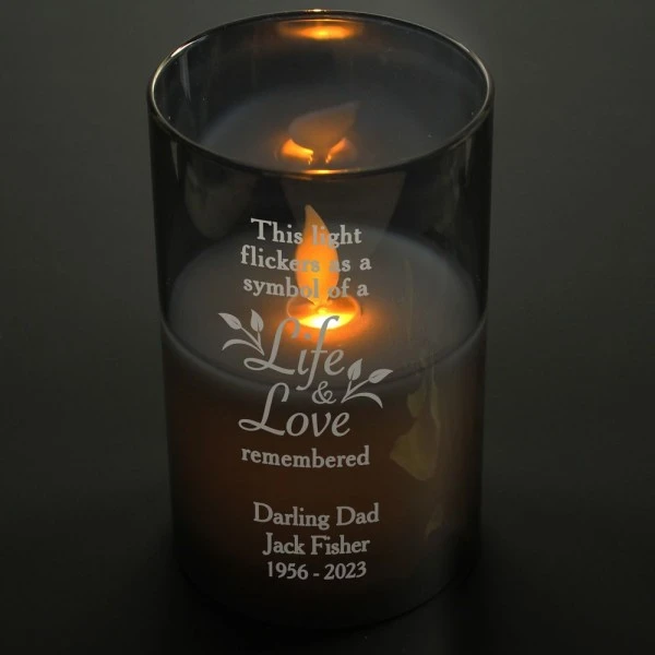Personalise this Life & Love Smoked LED Candle with 3 lines of text, as below.