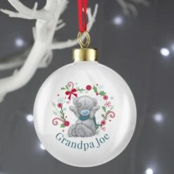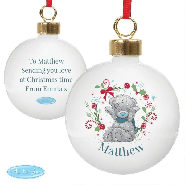Personalise this Me To You Christmas Bauble with name up to 12 characters on the front and a message to the back over 4 lines of 20 characters per line.