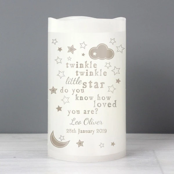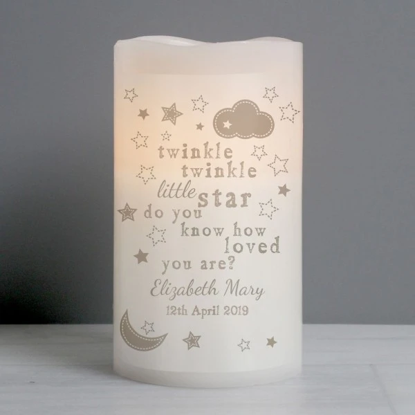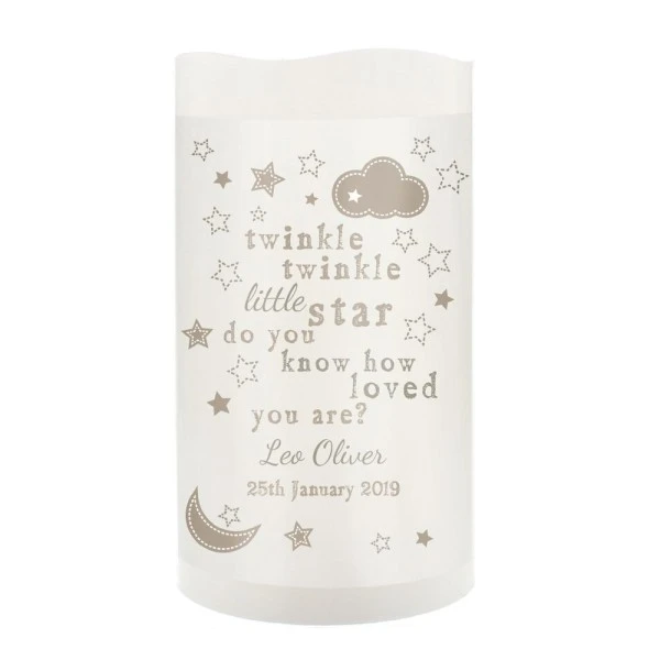 Personalise this Twinkle Twinkle Little Star LED candle with a name up to 20 characters and a date up to 20 characters.